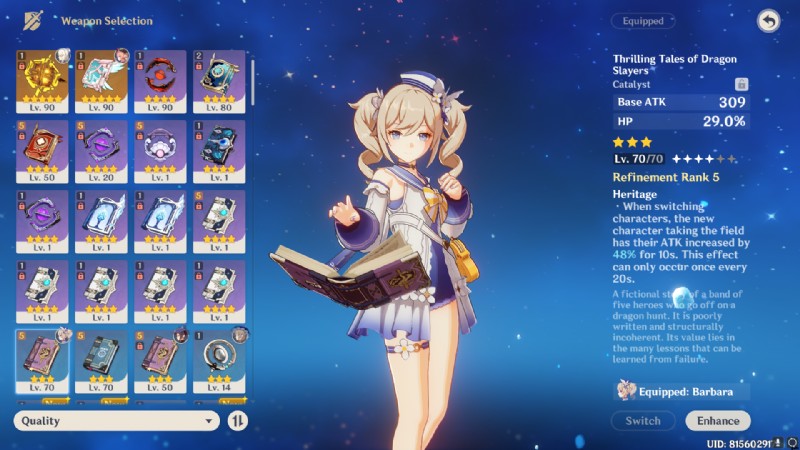 プレイヤーは、Thrilling Tales of Dragon Slayers を運ぶサポート触媒からメイン DPS に切り替えることで、メイン DPS の攻撃統計を高めることができます。 48% の ATK ブーストは、最大 5 つ星の ATK% アーティファクトとほぼ同じです。