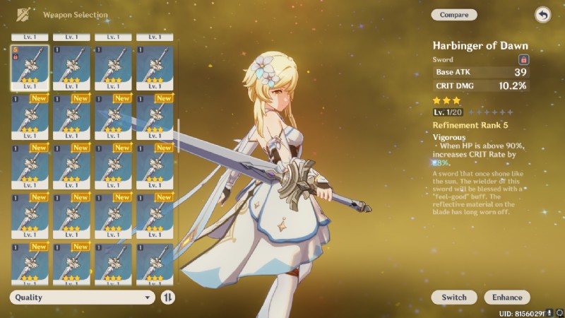 Harbinger of Dawn は、キャラクターのヘルスが 90% を超えている限り、壊れたパッシブを持ちます。この武器には、Genshin Impact で最も価値のある 2 つのステータス、クリティカル レートとクリティカル ダメージがあります。パーティにシールドやヒーラーがいない場合、パッシブを維持するのは難しい場合があります。