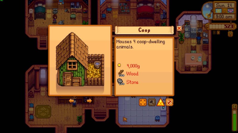 ゲームを初めて開始すると、作物の栽培に使用できる基本的な土地が用意されています。ただし、動物を飼育したい場合は、適切な建物を建設してアップグレードする必要があります。たとえば、ニワトリが必要な場合は、Coop を作成する必要があります。ロビンから購入できるファームのアップグレードの完全なリストは次のとおりです。