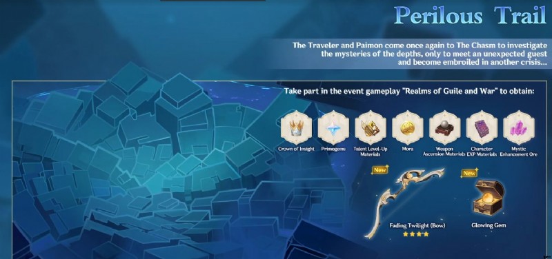 Genshin Impact 2.7 メインイベント、危険なトレイルの「Realms of Guile and War」セクションを進めると、Fading Twilight の弓の改良素材を無料で入手できます。