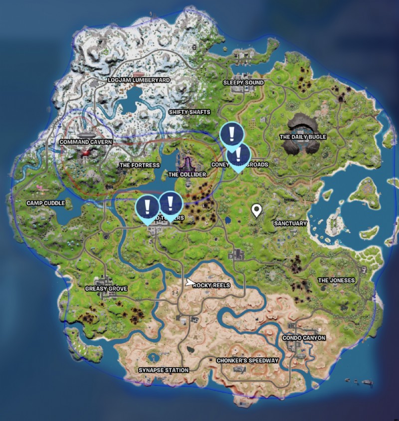 The Daily Bugle で最初のデバイス アップリンクを確立した場合は、Coney Crossroads に向かいます . Rocky Reels で最初のデバイス アップリンクを確立した場合は、Tilted Towers に移動してください。 プレイヤーは、利用可能な 4 つの緊急ビーコンの 1 つに近づき、操作してアクティブにする必要があります。緊急ビーコンは、作動するまで白い輝きでハイライトされます。