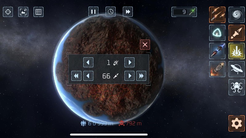 秘密を手に入れるためにオーダー66を執行 達成するには、大規模なミサイル弾幕を使用して惑星を完全に消滅させる必要があります。これを行うには、ミサイルをタップします 右側のボタンをクリックしてから、 が付いた上部のアイコンをタップします ミサイル 3 つ .右下隅に表示される歯車をタップすると、ミサイルの出力 (上のオプション) とミサイルの量 (下のオプション) の 2 つの設定が表示されます。