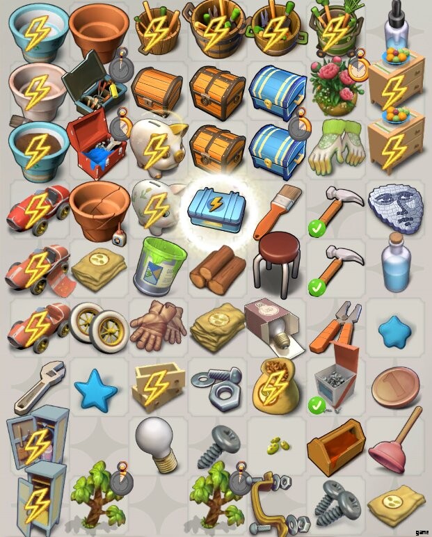 レベル 2 ブラウン ボックス | 22 ドロップ | 閉じた道具箱, ほこりだらけの道具箱, 引き出しノブ, 引き出しノブ, 茂みの種, 苗木, ブロンズコイン, ブロンズコイン (I), ブロンズコイン (II)、エネルギー (I)、エネルギー (II)、エネルギー (III)、タイムチャージャーの破片 (I) |