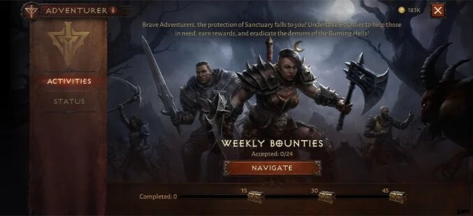 Shadows や Immortals とは異なり、Adventurers は Bounties を完了して Gold Cache を受け取ることしかできません。これらのキャッシュから良いアイテムがドロップされることもありますが、これはゲームの進行には十分ではありません。