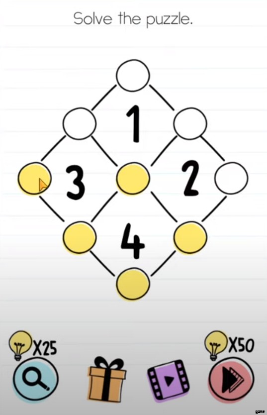 ここでは、4 つの異なる数字を持つダイヤモンドのような構造を見ることができます。また、ダイヤモンドの真ん中にいくつかの白い円と黄色い円が見えます。クリックすると、これらの円の色を白から黄色に変更できます。