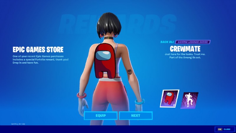 そこで、Epic Games Store から Among Us を購入し、Fortnite にログインしました。そして、Crewmate Back Bling と Distraction Dance Emote で歓迎されました。