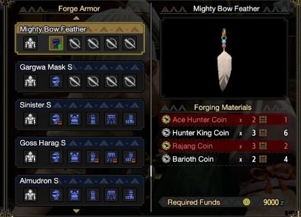 最終的にこれらのコインをすべて手に入れたら、カムラ村の2つの鍛冶屋の1つに行かなければなりません.そこで、これらすべてのアイテムをまとめて、マイティ ボウ フェザーを作成できます。今後のアリーナバトルも頑張ってください!