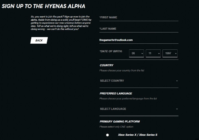 HYENAS クローズド アルファにサインアップするために従う必要がある段階的なプロセスは次のとおりです。
