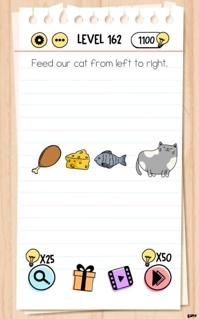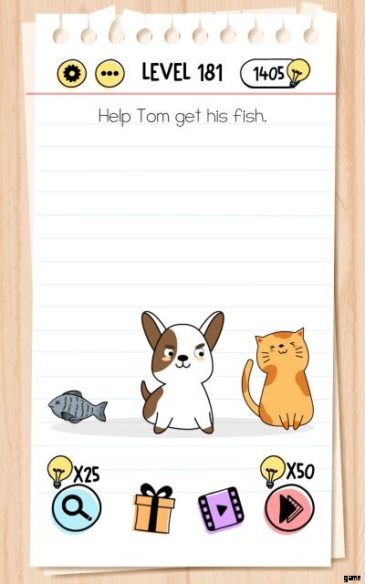 答え:犬をタップし、猫を犬の上に移動します。犬をもう一度タップし、猫を魚のそばに置きます。