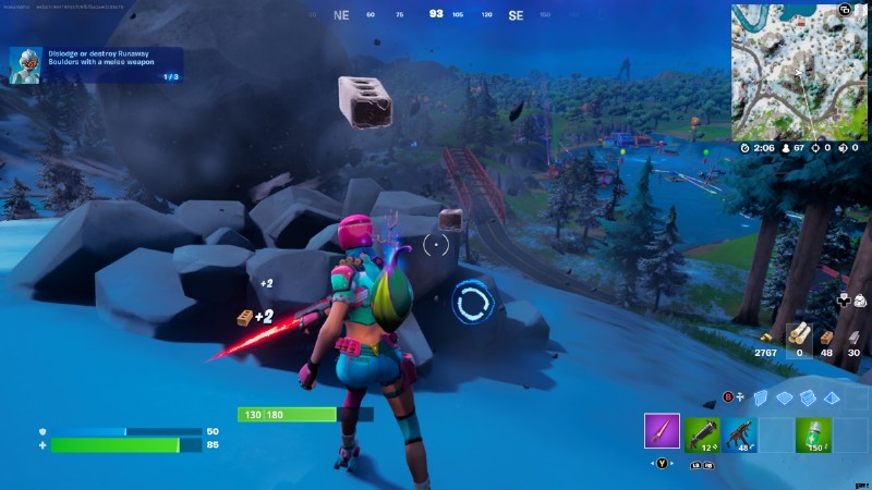 これらの岩は、Ballers を含むあらゆる武器または車両を使用して取り除くことができます .第 3 週のクエストでは、近接武器で 3 つの暴走岩を取り除くか破壊するようプレイヤーに求めます。このクエストを 1 回のマッチで完了したい場合は、マップの雪に覆われたエリアに向かいます。丘や山の頂上にこれらの岩がいくつかあるはずです。