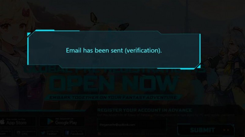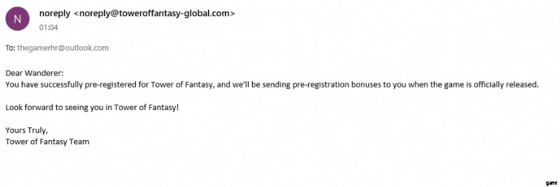 - 認証が成功すると、タワー オブ ファンタジーの事前登録を確認する最終メールが届きます