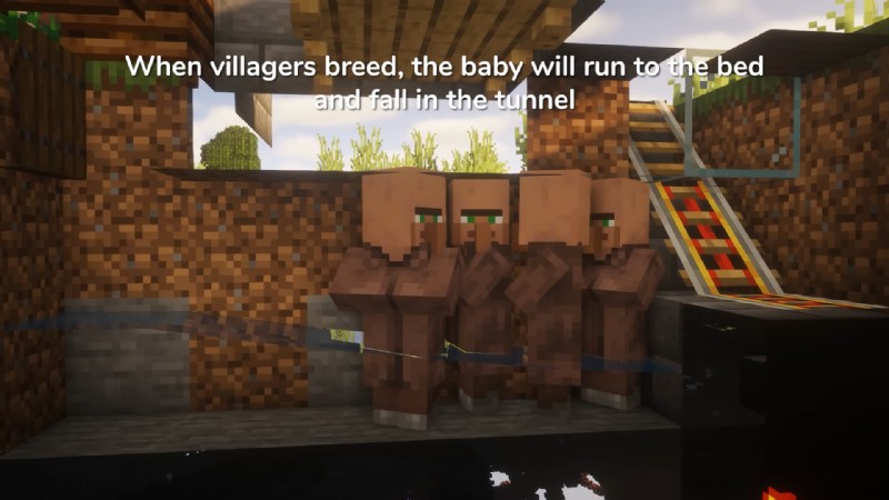 生まれたばかりの村人はベッドに向かって歩こうとしますが、落とし戸が原因で水流に落ちてしまいます。この村人ブリーダーは、トロッコで新しい村人を引き出すトロッコ システムを備えています。