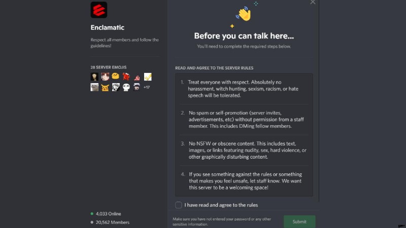 Enclamatic Simulations サーバーは公開の Discord であるため、サーバーへのフル アクセスを許可するには、さらにいくつかの手順を実行する必要があります。最初に、サーバー ルールを確認する必要があります。サーバー ルールは、最初にサーバーに参加したときに自動的にポップアップするはずです。