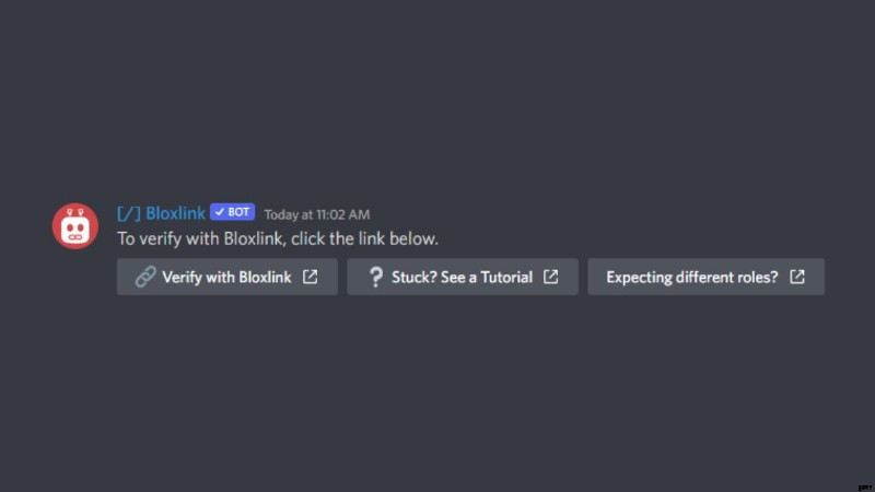#verification に進みます チャンネルを選択し、/verify と入力します チャットボックスで。 Bloxlink ボットから自動応答を受け取り、次のようなメッセージが表示されます:
