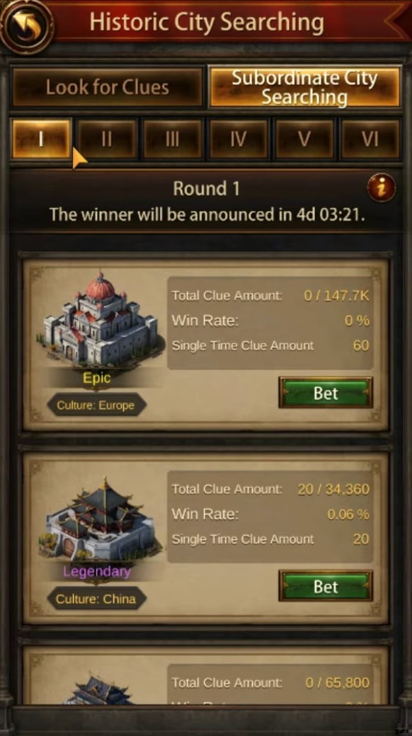 下位都市の手がかりをたくさん集めたら、イベントメニューを開いて「下位都市探索」タブに移動する必要があります。異なる従属都市に賭けることができる 6 つのラウンドがあります。賭け金が高いほど、イベント タイマーの終了後にこの都市を獲得できる可能性が高くなります。他のプレイヤーがあまり賭けていない都市を選ぶ時が近づいたら、賭けることをお勧めします。したがって、勝つチャンスが大幅に増加します。