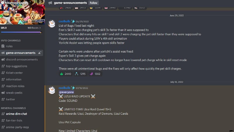 アップデート パッチ ノートのアニメ ディメンション Discord リンク
