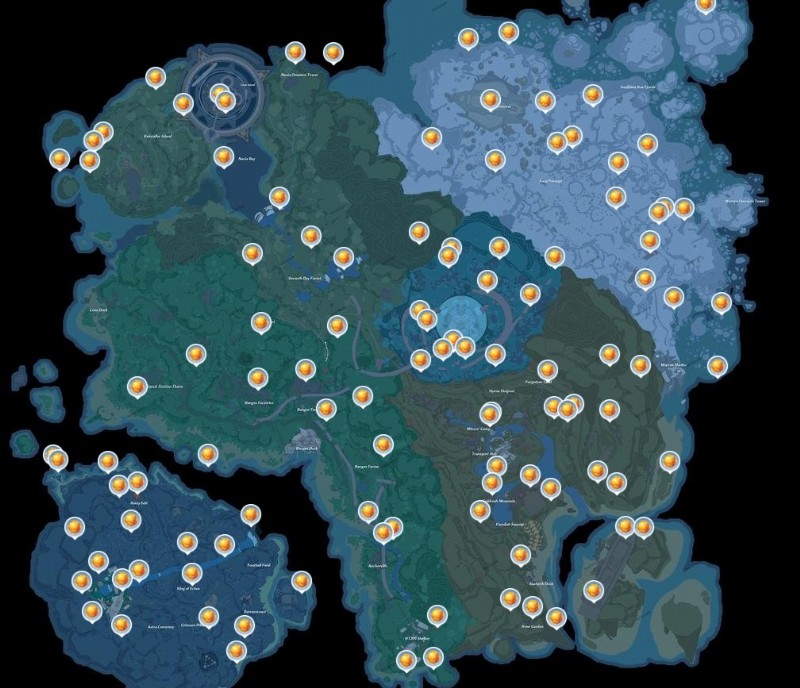 これは、タワー オブ ファンタジーのゲーム マップ上のすべてのゴールド ニュークリアスの位置を示すマップのスクリーンショットです。