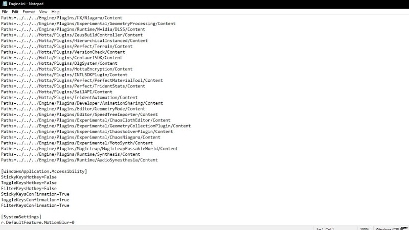 Windows の組み込み メモ帳 などのテキスト エディタ アプリで .ini ファイルを開きます 、そして [Core.System] の行が表示されます その中に、パスを含む一連の行が続きます。下にスクロールすると、[WindowsApplication.Accessibility] というタイトルの別のセクションが表示されます。 .