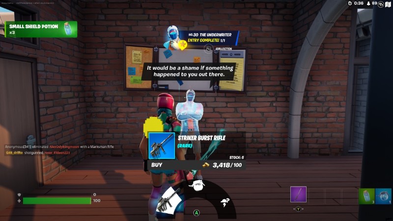 アンダーライターは ティルテッド タワーズ にあります。 レア ストライカー バースト ライフル、ラージ シールド ポーションを販売し、次のストーム サークルを予測できます。