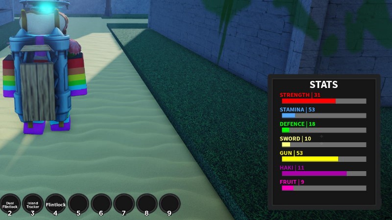 A One Piece Game の世界には 7 つの主な統計があります。 :筋力、スタミナ、防御力、剣、銃、覇気、果実 .各統計は、各動きの有効性を管理します。たとえば、強さは近接ダメージを決定し、スタミナは移動能力で消費できるエネルギー量を決定します。