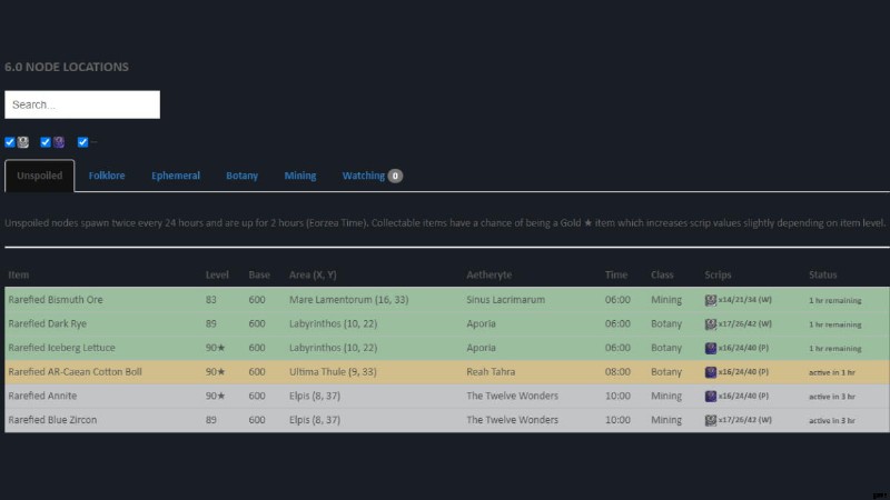 リストを絞り込むために、手付かずのノード、民間伝承、短命、植物学、採掘など、探しているもので正確に並べ替えることができます。このウェブサイトには、気になるアイテムだけに集中できる個人用のウォッチ リストもあります。ウォッチ リストに何かを追加するには、その行をクリックするだけです。
