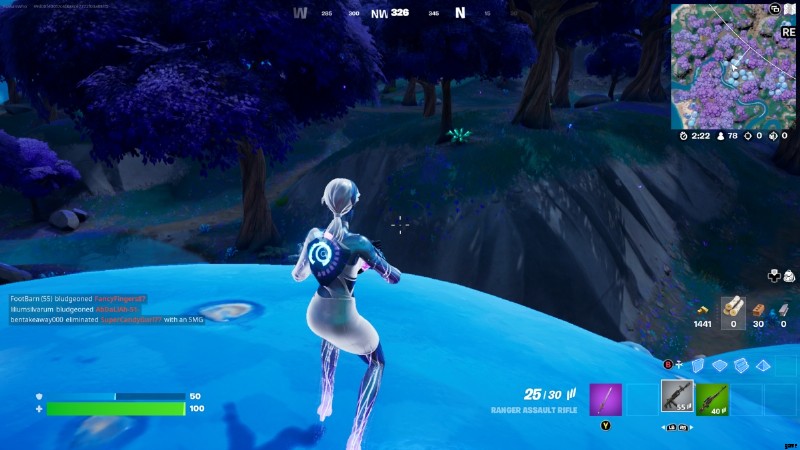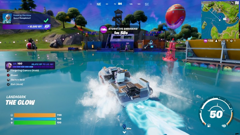 チャレンジは、これら 2 つのエリアのいずれかに着陸し、戦利品を手に入れてから、The Glow に向かうことです。これらすべてを 1 つのマッチで行うことができます。これを簡単に行うには、乗り物に乗り、 を使用するか、ニンバス クラウドをつかみ、マップを横切って次の目的地に到達できるようにします。近くのイノシシに飛び乗ってティルテッド タワーズに向かい、ボートに乗って海を渡ってザ グローに向かいました。