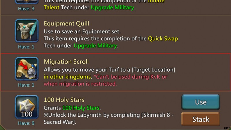 各プレイヤーは、ゲームの開始時から 1 回無料で移動できます。したがって、これを初めて行う場合は、多くのお金を節約できます。それ以外の場合、王国を変更するには移行スクロールが必要です。