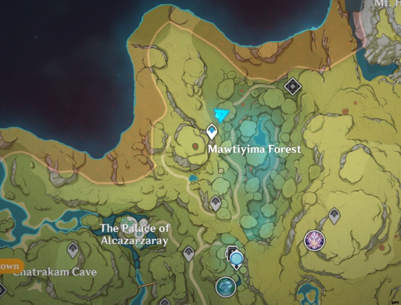 マウティイマの森では、上の画像に示すように、テレポートのウェイポイント近くの巨大なキノコの下に釣り場があります。プレイヤーは、昼間は深波のピーチ、ラズライト アックス カジキ、ハルシオン ジェイド アックス カジキ、夜はサンセット クラウド アンコウを捕まえることができます。
