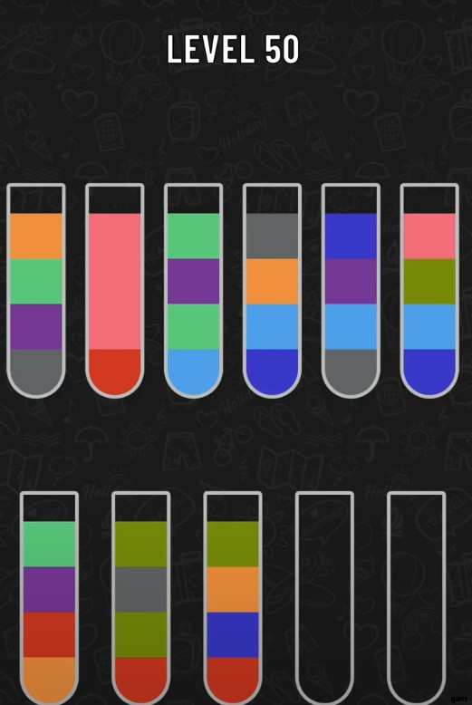 Water Sort レベル 50 は、このゲームで解決しなければならない数多くのパズルの 1 つです。カラフルな水が入ったバイアルがいくつかあり、それらを操作できます。このレベルを超えるには、あるバイアルから別のバイアルに水を注ぐ必要があります。それでは、これらのものとその中の色を見てみましょう: