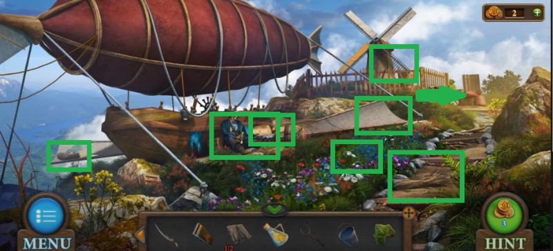 - オーブンの近くでは、オーブン フォーク、バケツ、ミルの半分、オイルを入手できます。その後、最初の場所に戻り、岩の上でダイナマイトとマッチ箱を使用します。爆発後、水が出始め、製粉所の半分を取ることができます。次に、バケットをシャックルに接続し、水を入れます。ボックスのハーフ オブ ザ ミルを使用して、2 番目のミニゲームを開始します。それを解決するには、オブジェクトを同じ色の場所に移動する必要があります。