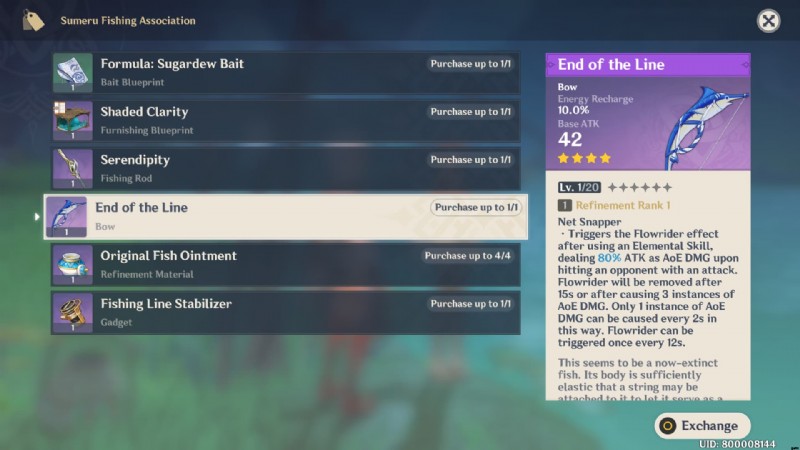Genshin Impact では、次のようなエキゾチックな魚と引き換えに、ルムラットというスメルの漁師からエンド オブ ザ ラインの弓を手に入れることができます。