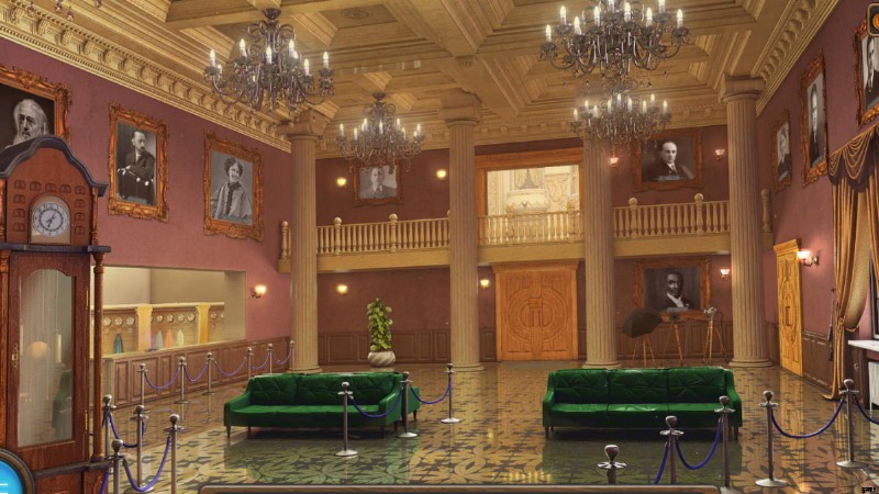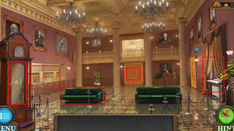 ホワイエに戻ります。左上の壁の中央の絵を調べると、彼の年の数字が 3 つしかないことに注意してください。コート カウンターに行き、ベンチに置かれたブリーフケースを調べて、車輪を入力します スロットに。コードは絵で見た 3 つの数字です。
