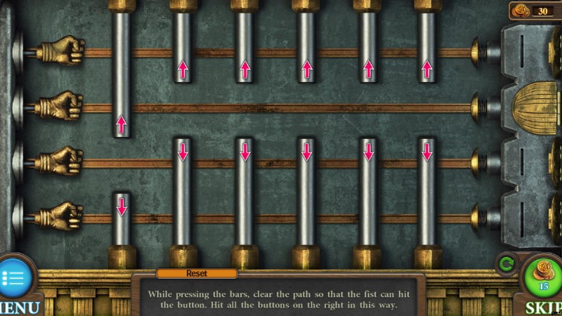 2 つの メタル マスクで 手に持って、部屋の右側にあるドアを調べます。パネルの中に入れて、エピソードの最後のパズルに備えましょう。このパズルの目的は、同じ色または表情の 2 つのマスクが同じ行または列にならないようにマスクを配置することです。マスクは自由に移動できます。