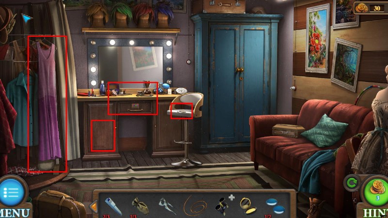 パズルを完成させると、内側のコンパートメントから 鍵 が現れます .楽屋に戻り、それを使用して青いドレッサーのロックを解除します. サンドバッグ(3/3)を取る 、次にシャツを調べて横に折りたたんでから、レンズを取ります (2/2) 内ポケットから。レンズを壊れた双眼鏡と組み合わせる 双眼鏡を修理する .