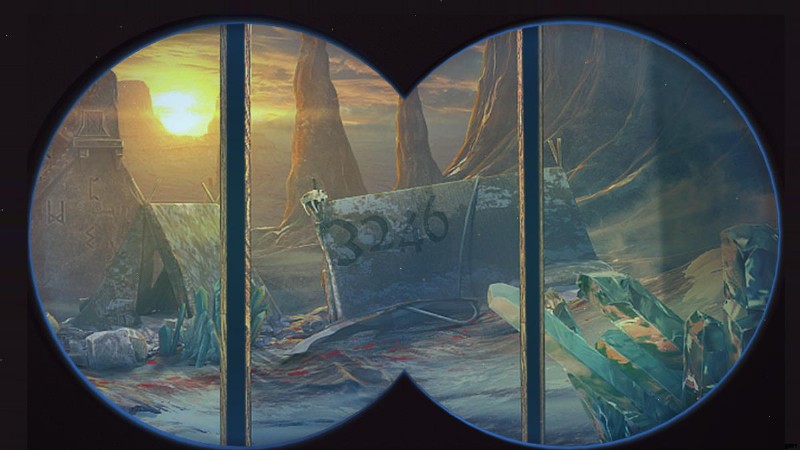 舞台に戻る。上部の聴衆ボックスのメモを思い出すと、金庫のパスワードは「風景にある」ので、双眼鏡を使用してください 背景を詳しく見ることができます。スキャンすると、小さなスラブに書かれた 4 桁の組み合わせが表示されます。