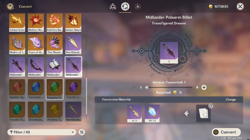 <オール>それでおしまい。変換ボタンを押すと、ミッドランダーのビレットが手に入ります。これらのビレットを使用すると、Genshin Impact で Sumeru 武器をうまく作成できます。ミッドランダー ビレットは、Genshin Impact で次の武器を作成するために使用されます: