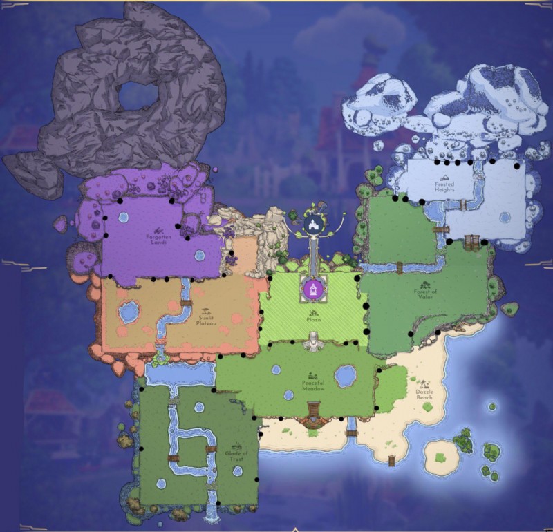 開始のプラザ エリアに続いてピースフル メドウズの場所を除外すると、ディズニー ドリームライト バレーは 6 つの異なるバイオームを提供し、プレイヤーはゲームを進め、ドリームライトを使用して 6 つのバイオームのそれぞれへの入り口を塞いでいるナイト ソーンを取り除くことでロックを解除できます。
