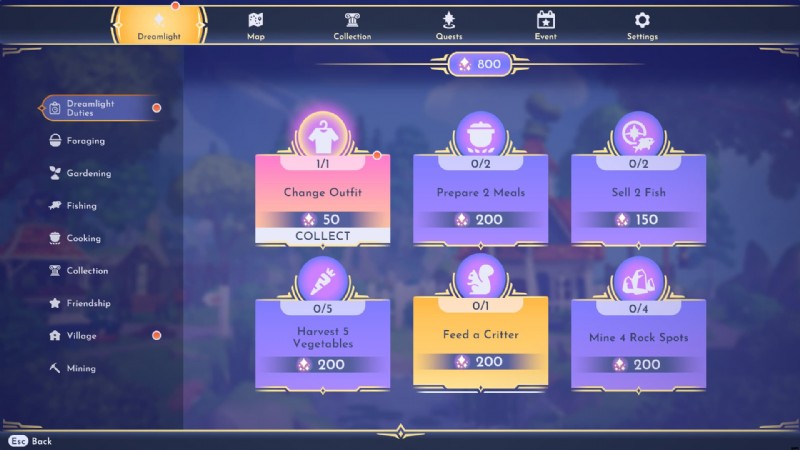 簡単です!コンソールでゲームをプレイしていると仮定して、ESC キーまたはそれぞれのキーを押して、一時停止メニューに移動します。一時停止メニューの Dreamlight の下に、Dreamlight Duties があります。タスクを確認してください。服装を変えたり、写真を撮ったり、食事を準備したり、4つの岩場を採掘したりするだけです。ドリームライト デューティを完了し、それらをクリックして、報酬としてドリームライトを獲得します。