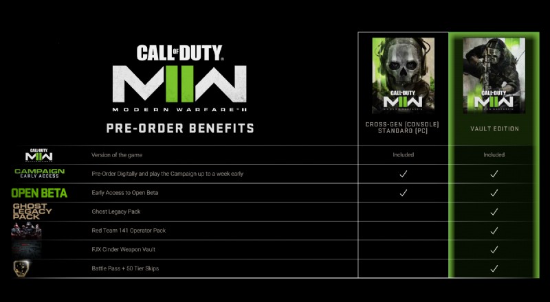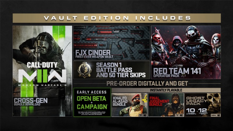 Standard Edition などの上記の限定アイテムとアクセスとは別に、Call of Duty MW2 Vault Edition をデジタルで事前注文すると、ゲームのキャンペーン モードに 1 週間早くアクセスできます。キャンペーンは 2022 年 10 月 20 日からプレイできます。一方、完全なゲームは 2022 年 10 月 28 日の発売時に利用可能になります。