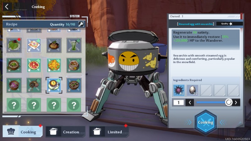 または、ウニを見つけるのが難しい場合は、1 つのウニと 14 の家禽の卵を使用して、タワー オブ ファンタジーでウニ入り蒸し卵のレシピのロックを解除することもできます。