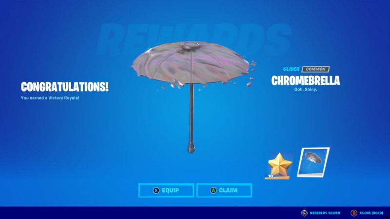 この伝統は、シーズン 1 のアンブレラでの Fortnite の冒頭にさかのぼります。それ以降、Victory Royale を獲得したすべてのプレイヤーは、傘の形をした特別な季節をテーマにしたグライダーを獲得します。今シーズンは、テーマに完全に適合するリキッド クロームをテーマにしたビクトリー ロワイヤル アンブレラ グライダーがあります。