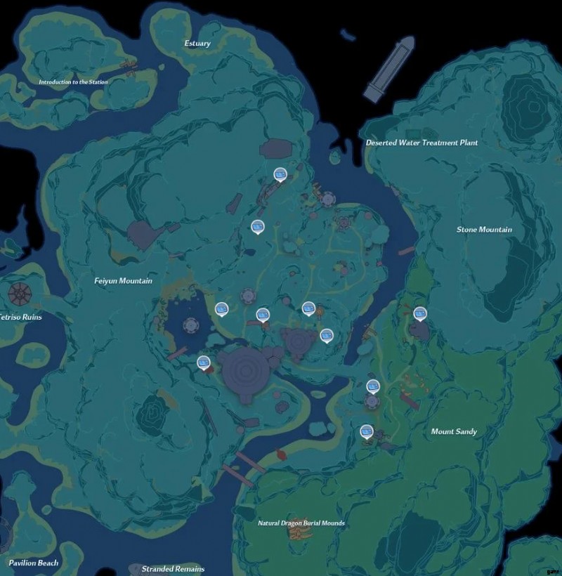 タワー オブ ファンタジーの開発者ログは、人工島のいたるところにあります。これは、人工島のクエストラインを進めるために必要な各開発者ログの正確な場所を共有するマップのスクリーンショットです。