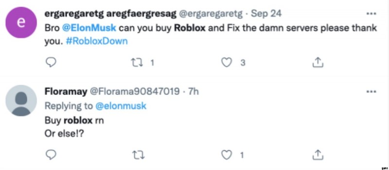 実際、今すぐ Twitter にアクセスして検索に Elon Musk Roblox と入力すると、どちらか一方を要求しているツイートがたくさん表示されます。噂の正確な出所を突き止めることはできませんでしたが、彼が Twitter を 440 億ドルで買収する入札を行ったときに始まった可能性が高いと推測できます。この取引は成立しなかったようですが、Twitter の株主が最近この提案を承認したことから、しばらくは真剣に取り組んでいるように見えました。それはまだ確認されていませんが、彼がRobloxを購入したという噂には、より簡単な答えがあります.