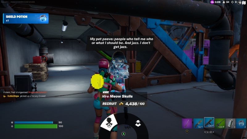 チャプター 3 シーズン 4 では、チームメイトとして雇うことができる NPC が 6 人いました。雇用には 100 ゴールド バーが必要で、一度に雇用できるのは 1 人のキャラクターだけです。これらのキャラクターはあなたについてきたり、敵や野生生物に発砲したりできますが、建物を建てたり、乗り物に乗ったり、弾薬や回復アイテムを与えたりすることはできません。これらの NPC は、他の NPC が持つ 3 つのドットの代わりに、人のアイコンによって遠くから認識できます。