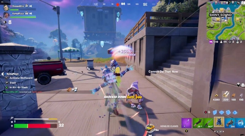 ハウラークローを使用して、敵や建造物を斬撃したり、ダッシュスラッシュ攻撃(エアスラッシュ)を実行したりできます。エアスラッシュは、プレイヤーがダブルジャンプアクションを使用して全力疾走しているときにのみ実行できます。これは敵の近くに移動するのに最適な方法ですが、ストームの危険エリアからすばやく脱出するためにも使用できます。