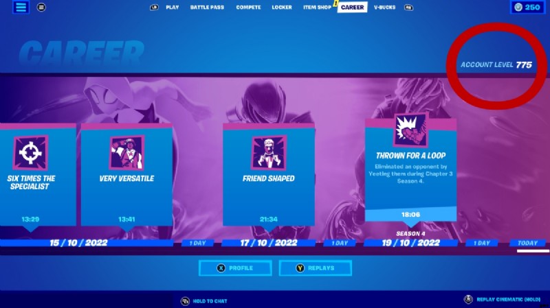 アカウント レベルは XP レベルとは異なることに注意してください。アカウント レベルは、Fortnite のプレイ中に獲得したレベルの合計数です。 Fortnite の [キャリア] タブにアクセスすると、アカウント レベルを確認できます。アカウント レベルは、通常どおり XP でレベルアップすることに加えて、キャリア セクションにもあるバッジを獲得することで上げることができます。