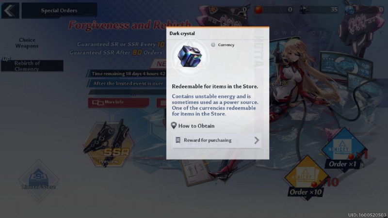 一定数のダーククリスタルを集めたらレッドニュークリアスと交換し、スペシャルオーダーメニューから期間限定スペシャルオーダーのバナー、今のところ転生のクレメンシーを選んでガチャを引く。