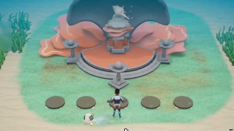 私たちは、他の皆さんと同じように、しばらくの間水中を探索しており、謎の二枚貝の像に出くわしました。ハマグリの前には小さな台座があり、上に乗ると音が出ます。これは音楽パズルの可能性を示しています。