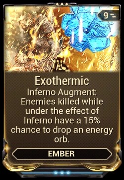 Emberは、火のスキルで莫大なダメージを与える興味深いキャラクターです.ただし、この Warframe はすぐにエネルギーを消耗するため、Exothermic mod を使用することを強くお勧めします。 Ember がより多くのエネルギー オーブを取得し、その主な問題に対処するのに役立ちます。