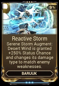 Reactive Storm は Baruuk 用の強力な増強 Mod です。対戦相手の脆弱性に適応し始めるため、この Warframe はより危険になります。また、セリーヌ ストーム スキルのステータス チャンスが追加されます。